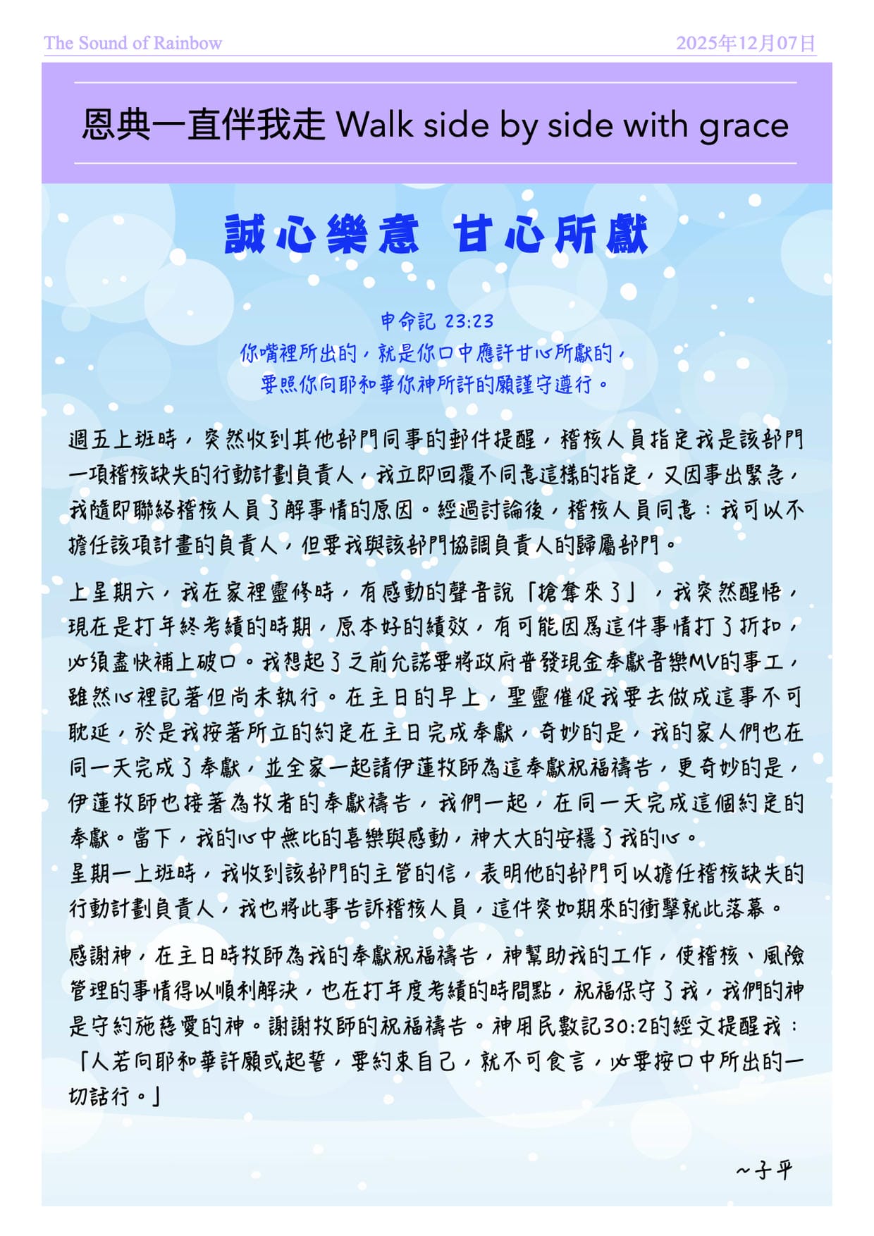 2025/12/07 子平見證分享:誠心樂意 甘心所獻